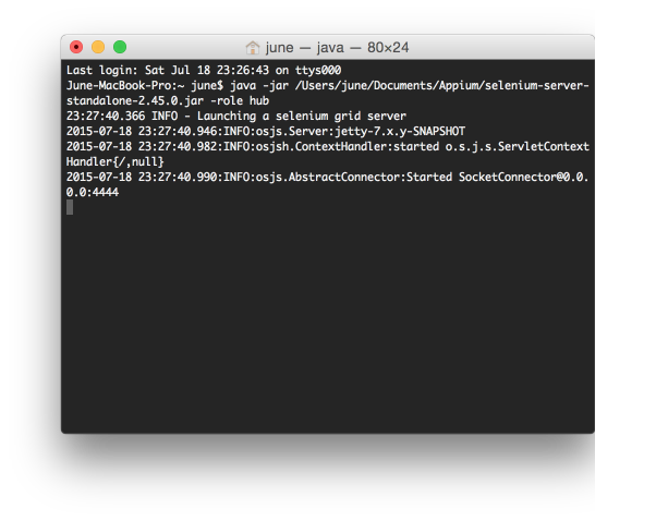 java -jar "selenium server 경로" -role hub을 입력하고 Enter 하면 hub가 설정된다. 브라우저 창에서 localhost:4444를 화면이 나오면 성공appium -p 4724 -bp 4714 --nodeconfig "json파일 경로" 입력 후 엔터치면 server가 실행된다. 동일한 방법으로 단말기 개수만큼 node server를 실행해주면 된다.